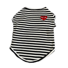 Infuse a touch of designer style into your dog's wardrobe with the CDG Striped Jumper. Inspired by the iconic Comme des Garçons aesthetic, this cozy jumper combines fashion-forward stripes with a playful heart emblem. Tailored for small to medium dog breeds, it ensures a snug and comfortable fit, keeping your furry friend stylishly warm on every outing.