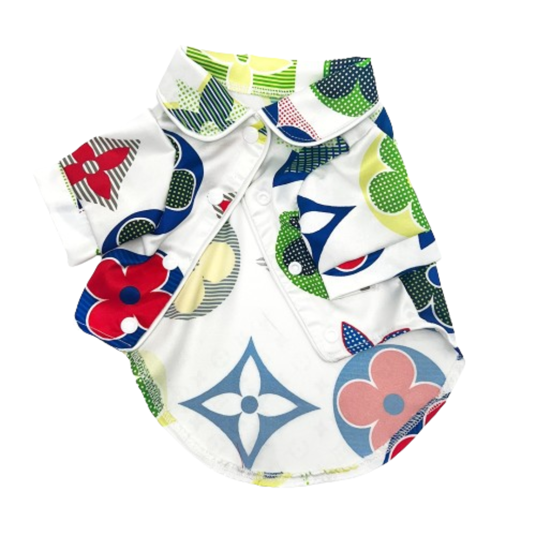 The Chewy V Button Vogue Shirt is a must-have for any stylish pup's wardrobe. Inspired by Louis Vuitton, this shirt features a bold, colorful pattern that makes your dog stand out. Made with lightweight, breathable polyester, it ensures comfort during any adventure. Perfect for all seasons, it's easy to wash and wear, making it not just stylish but practical too!