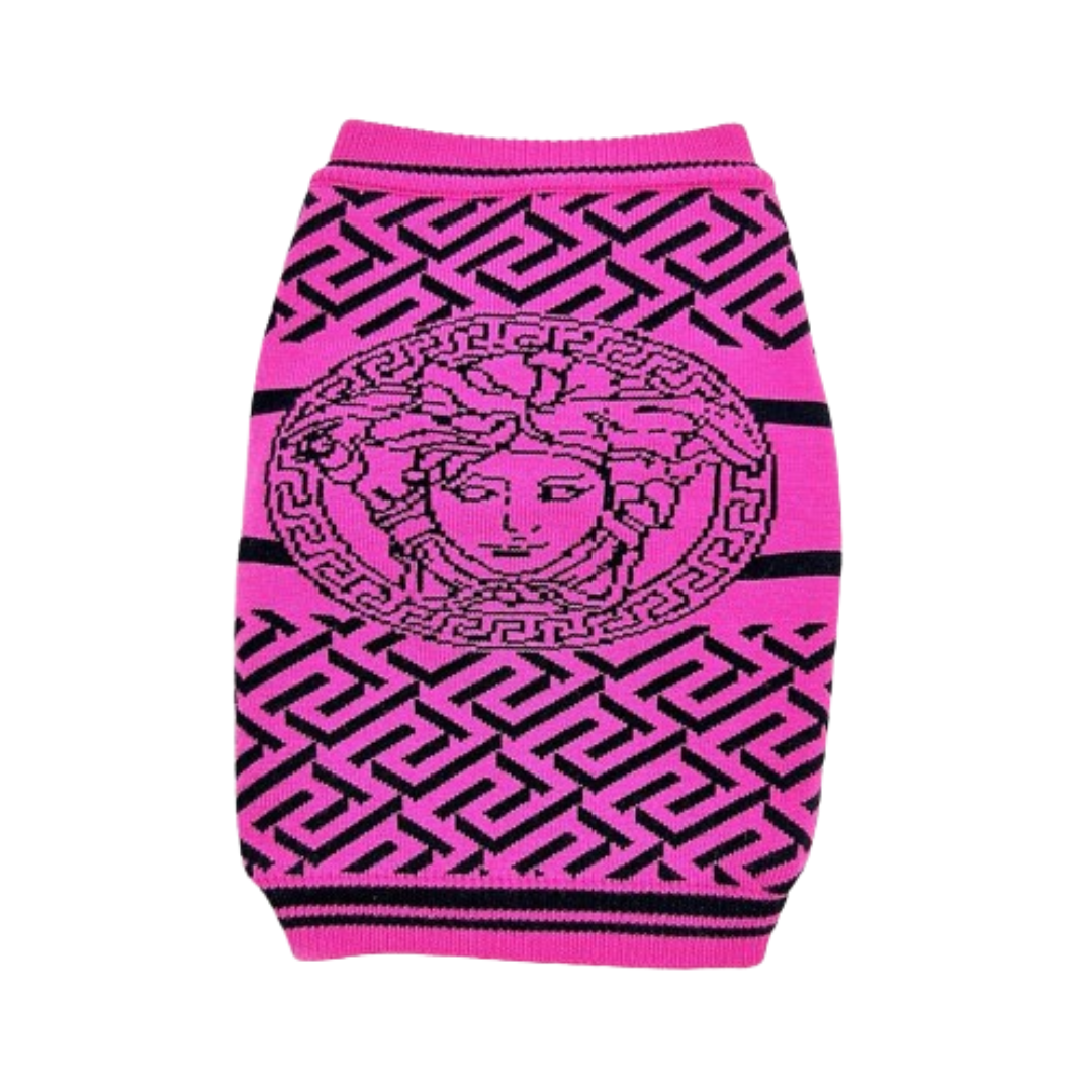 Dress your furry friend in the Pawsace Snug Seasonal Sweater, inspired by the luxurious designs of Versace. This sweater is crafted from soft, breathable 100% cotton, ensuring your pup stays warm without sacrificing comfort. Featuring a bold, eye-catching pink and black geometric pattern with an iconic centerpiece design, it's the perfect blend of fashion and function. Suitable for small to medium-sized dogs, it offers easy wearability and care, ideal for daily use.
